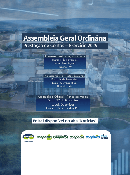 Prezado (a) cooperado (a), sua participação na AGO é muito importante para a Coopatos. Atualize seus dados cadastrais até o dia 26/02/2026 (quinta-feira) para estar apto a votar. Contamos com a sua presença! Patos de Minas, 09 de fevereiro de 2026. Prezado Senhor (a), A Administração da Coopatos visando manter seus associados informados sobre os […]