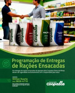 As entregas de rações ensacadas da Agropecuária Coopatos – Patos de Minas devem ser agendadas exclusivamente com o responsável pelo setor.