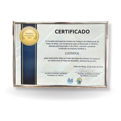 O Conselho Municipal dos Direitos da Criança e do Adolescente de Patos de Minas concede o presente Certificado a COOPATOS pelas destinações feitas ao fundo municipal dos Direitos da Criança e do Adolescente em Patos de Minas/MG, exercício fiscal 2021.