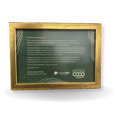 Certificado do Selo SomosCoop Excelência em Gestão. Em reconhecimento a um grupo seleto de 222 cooperativas em todo o Brasil, alcançaram uma pontuação média superior a 80% dos índices exigidos pela banca examinadora.
